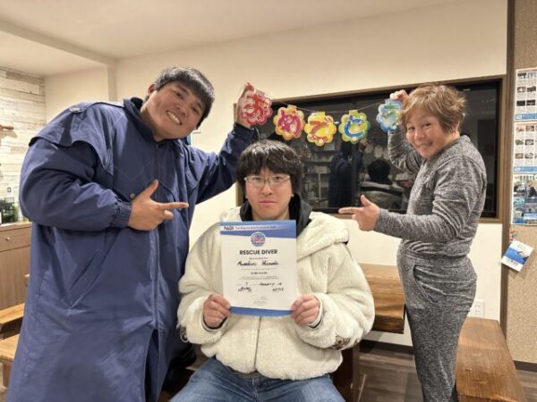 | お祝いコメント | 下田さん、念願のPADIレスキューダイバー認定おめでとう御座います\(^o^)/ 少しは自信がつきましたか!? とえも学ぶことが多く、たくましくなれるコースでしたが、今日の海洋雑誌やも最後まで頑張りましたね。 今後はアマチュアダイバー最高ランクのマスタースクーバダイバー(MSD)目指して、頑張ってください。 |