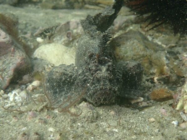 | 生物うんちく | 27年前くらいは、名前がわかっていなかったので「雑巾ウオ」と勝手に命名していました笑 体色は黒とか焦げ茶色でとても地味ですが、カエルアンコウのような、ハダカハオコゼのような、ボロカサゴのような動きをします。 こう見えて、胸ビレを使いながら、一所懸命に体をローリングさせながらよっこらしょっ!とあるいたり、体をくねらせてジャンプしたりします。 今回も体をくねらせて動いていたのをたまたま見つけてラッキーでした。 |