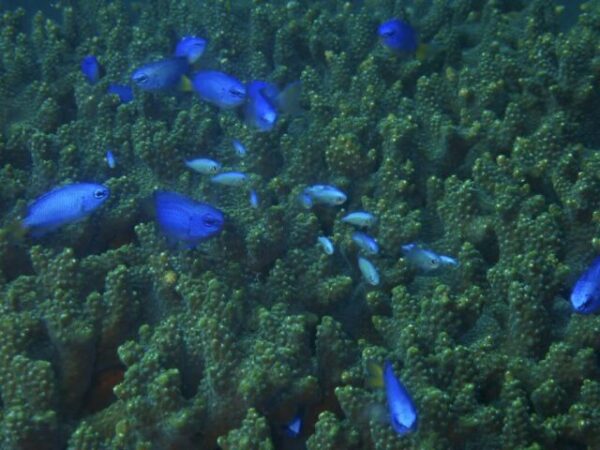 | 生物うんちく | 写真の大きいブルーの魚はソラスズメダイですが、ソラスズメダイより少し水色の淡い感じの体色をしていて尻尾まで同じ色をしています。 まだ幼魚ですが10数匹群れになっています。 このまま成長して、もっともっと数が増えて沖縄みたいになってくれると嬉しいですね。 |