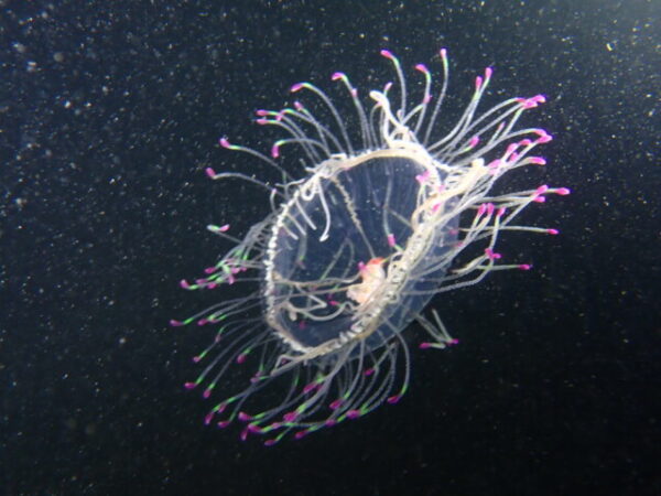 | 生物うんちく | 傘にも筋模様が入り、ピンク色とグリーンの蛍光色の触手が飾りのように見えるとてもキレイで人気のクラゲです。 |