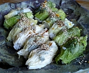 これは初めて口にする「白菜のにぎり」!初めて見てびっくり!知っちょる人いますかぁ?(#^.^#) 漬け物で証明されてるように寿司飯と会うのはもちろん、柚子が上にチョロッと乗っちょるんですが、これがまた絶妙なハーモニーなわけなんすよ。食べてもびっくりでしたぁ(☆_☆) 場所を教えたくても連れて行けないなが残念ですわ。今晩トンボ帰りします(>_<)