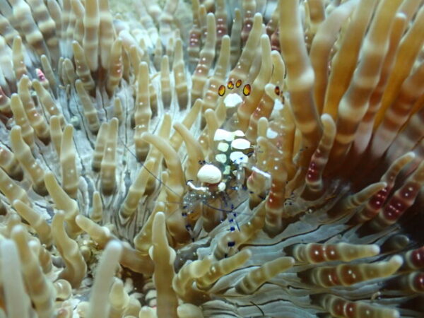 サンゴの裏にいたエビちゃんは小さすぎ…。他にもエンマカクレエビ・オドリカクレエビ・カザリイソギンチャクエビ・イソギンチャクモエビ…アシビロサンゴヤドリガニ・アミメサンゴガニ・キモガニ…探せばいくらでも出てくる(笑)