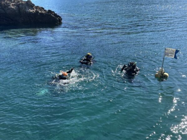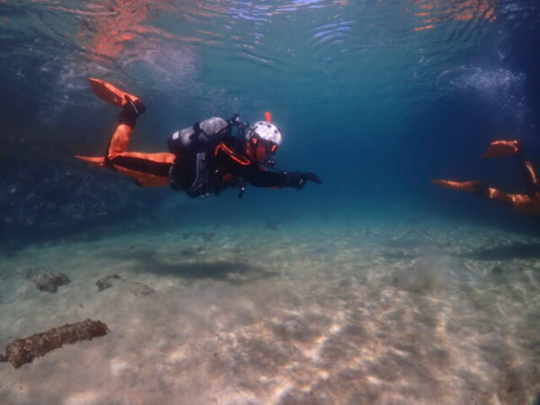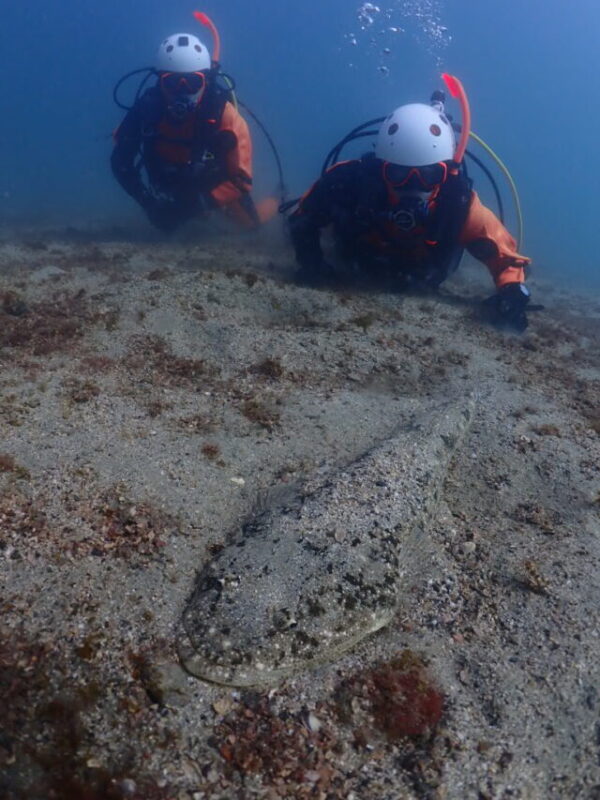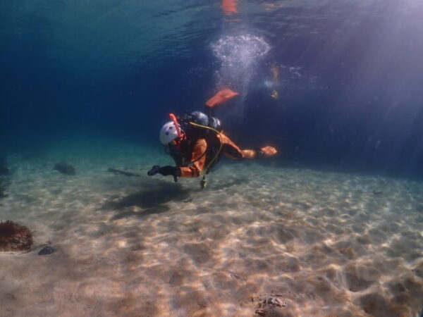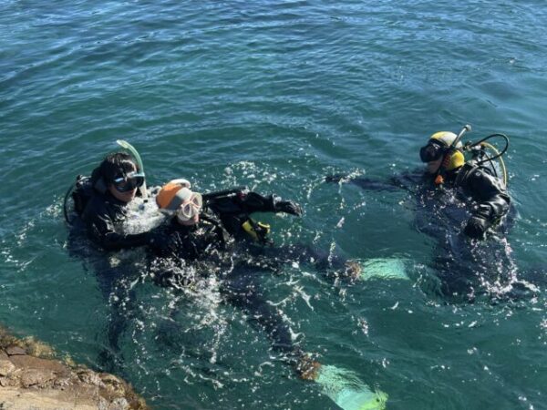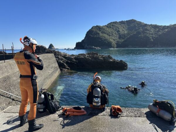 ▲日向消防署の潜水隊は、これまでやっていない捜索パターンのスパイラルサーチとUサーチ、そして事故者を水面へ引き上げる方法なども練習しました。