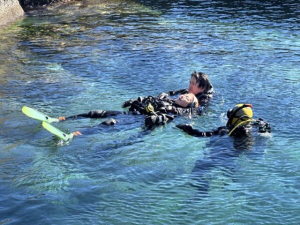 ▲そして、プロダイバーの潜水隊の横で、スタッフ聖斗と真由美はSさんのPADIレスキューダイバーコースの海洋実習!楽しいダイビング中にトラブルや事故がないように、予防法をしっかり学ぶのが、このレスキューダイバーコースです。そして、万が一があっても自分の安全を確保しながらサポートや救助が出来るようにレベルアップします。潜水隊の面々も、水面で人工呼吸法を始め、救助の様々な方法に興味津々でした。笑各々、しっかりトレーニングを終えて、Sさんも無事にPADIレスキューダイバーに認定です\(^o^)/おめでとう御座います