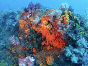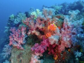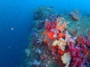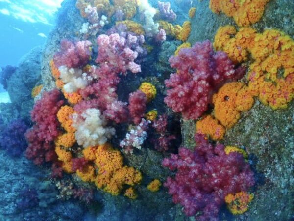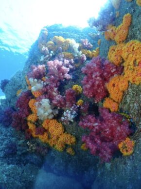 ▲相変わらずの一面カラフルなソフトコーラルの群生に覆われた隠れ根の周りはレンテンヤッコやシテンヤッコ、コガネスズメタイ群、キンギョハナダイ群、ムレハタタテダイ群、タカサゴ群などで賑やかでした。