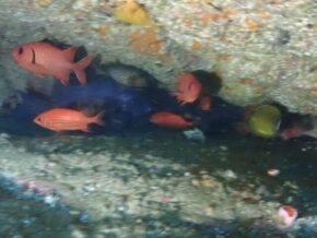 ▲北側の水中トンネル内は、相変わらずキンメモドキ群やツマグロハタンポ群、アカマツカサ群、イシガキフグ、イタチウオなどがウジャウジャいて賑やかでした。