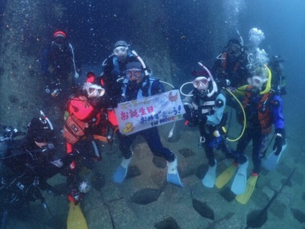 1本目は運良く、リクエストの「島んだ宮殿」に潜る事ができました。週末はほぼ潜れないのにラッキーです。そんな中、エリートのリピーターゲストさんが延岡でバースデーダイブを迎えました\(^o^)/
