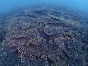 ▲相変わらずのモリモリのサンゴの群生の周りにはカラフルなチョウチョウウオやスズメダイの仲間が群れていて綺麗でした。