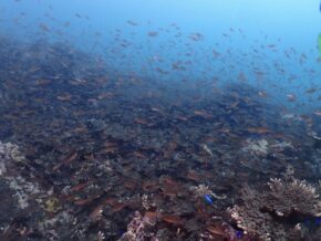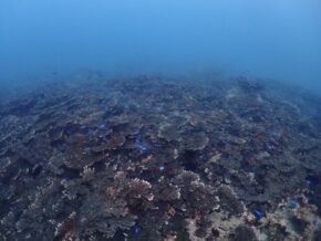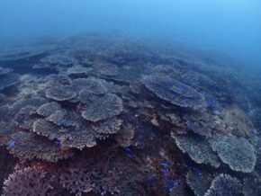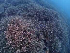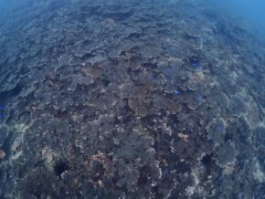 ▲相変わらずのモリモリのサンゴの群生の周りにはカラフルなチョウチョウウオやスズメダイの仲間が群れていて綺麗でした。