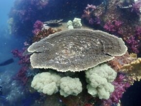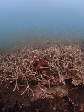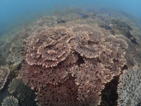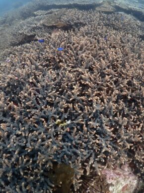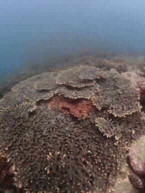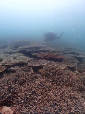 ▲残念ながら濁りがありましたが、約100種の辺り一面に広がるモリモリのハードコーラル群を見て頂いて喜んでいただきました。