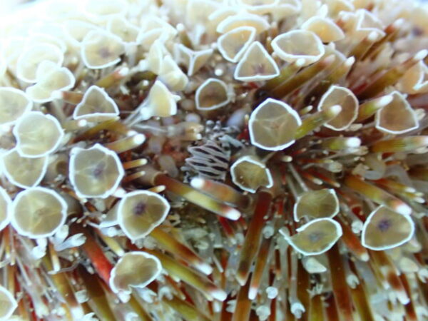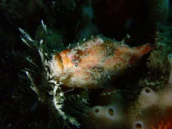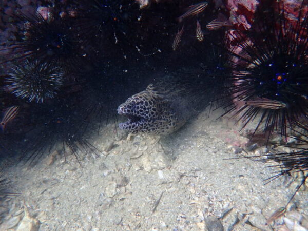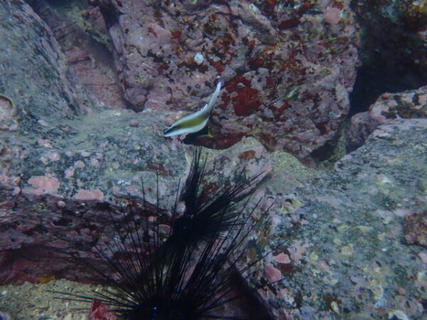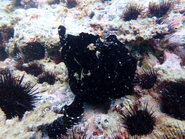 今日は延岡ダイブの最終日のWさんとマリンメンバーと一緒にまったりビーチダイブを楽しみました。先ほどの写真の答え!実はイロカエルアンコウの手(胸鰭)です。ウニの上置いていながら微動だにしません。…痛くないのかな~。1本目・2本目と体の向きは変えるのに、必ずウニの上に手を置いてる…。マッサージなのかしら(笑)。