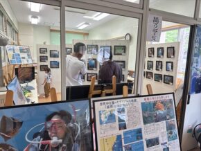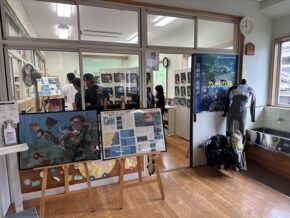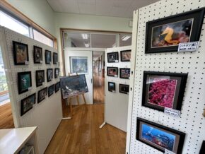 ▲今回は特に浦城付近の海中写真を含め3サイズの写真約100点と、来るのがお子様も多いので魚の名前が分かるように写真ひとつひとつに説明プレートを付けて展示しました。