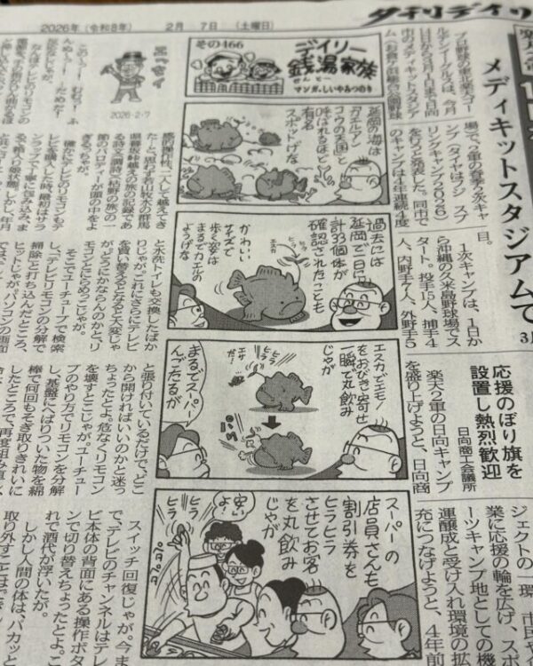 ◆延岡で唯一の夕刊新聞「夕刊デイリー」には、時々お世話になっている延岡マリンサービスですが、今回はなんと!漫画家のしいやみつのりさんが夕刊デイリー内に連載する「デイリー銭湯家族」という4コマ漫画その466号に、延岡の海のアイドル「カエルアンコウ」がネタとなりました!\(^o^)/