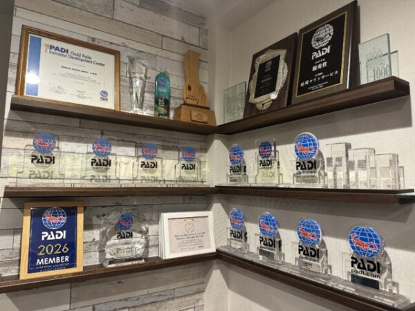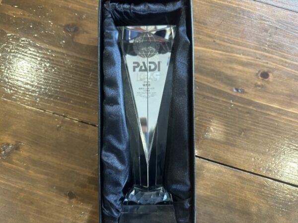 その2つのトロフィーをPADIのエリアマネージャーの納富氏に手渡しして頂きましたので、早速店内に飾りました。