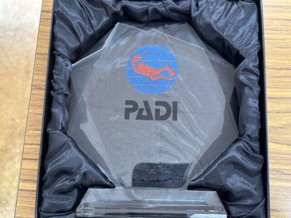 その2つのトロフィーをPADIのエリアマネージャーの納富氏に手渡しして頂きましたので、早速店内に飾りました。