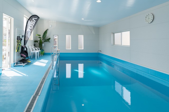 構想20年の末完成した温水&全天候型の屋内自社プール。台風シーズンや悪コンディション時はもちろん、仕事上がりや夜間にもトレーニングダイブやリフレッシュダイブが可能。