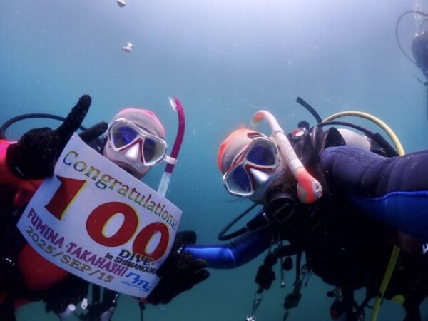 | お祝いコメント | 史奈くん、あっという間の祝100ダイブ記念、おめでとう御座います! 潜れば潜るほど、海が好きになりダイビングが楽しくなるでしょ! これからももっともっと様々な海やポイントは潜って、様々なスタイルのダイビングを経験していこうね! |