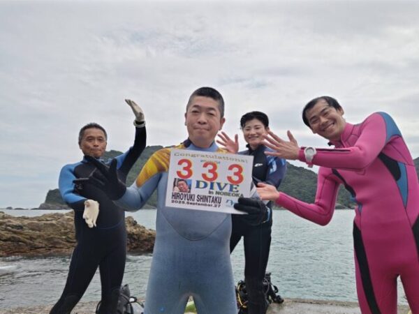 | お祝いコメント | 新宅さん、念願の延岡で祝333フィーバーダイブ記念おめでとう御座います! 流れ流れだっただけに、自分たちスタッフもホッとしております。 今後も熊本から頑張って通って頂き、たくさん潜ってストレス解消してくださいね。 |