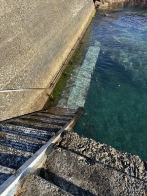▲みんなが2本目遊んでいる間に、スタッフ勝栄と聖斗の二人でダイビングタラップの着いてきていた苔をたわしでこすって落としました。