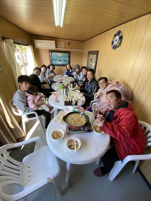 この日、天気も最高に良く風もなかったので、海見ながら外で食べようとしていましたが、海底清掃している間に少し南西の風が吹き始めたので休憩所内に変更!